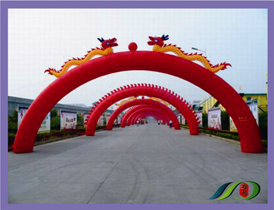 拱門主要適用于各行各業(yè)大型室外活動(dòng)、慶典、剪彩等。充氣拱門一般采用優(yōu)質(zhì)PU材料,近年來(lái)也推出針對(duì)性的pvc材料。但牛津布材質(zhì)的拱門最常用。耐磨、耐用、耐曲折、柔軟度好、抗拉強(qiáng)度大。拱門指氣球上端呈弧形狀的一個(gè)跨度門。拱門有多種多樣:雙龍拱門、龍鳳拱門、單拱門、雙拱門、連排拱門、造形定性拱門等。尺寸:6米--18米不等。