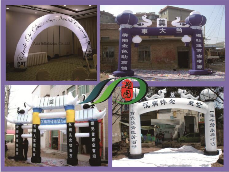 拱門主要適用于各行各業(yè)大型室外活動、慶典、剪彩等。充氣拱門一般采用優(yōu)質PU材料,近年來也推出針對性的pvc材料。但牛津布材質的拱門最常用。耐磨、耐用、耐曲折、柔軟度好、抗拉強度大。拱門指氣球上端呈弧形狀的一個跨度門。拱門有多種多樣:雙龍拱門、龍鳳拱門、單拱門、雙拱門、連排拱門、造形定性拱門等。尺寸:6米--18米不等。