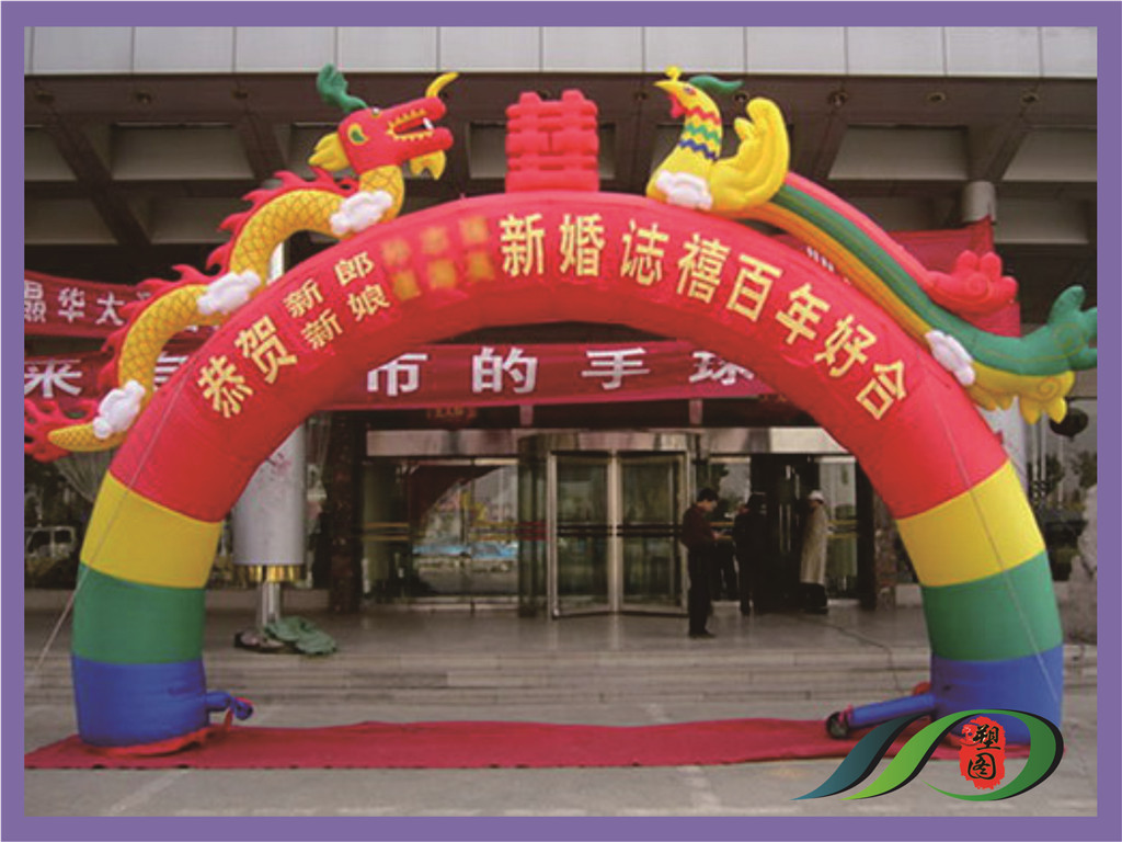 拱門(mén)主要適用于各行各業(yè)大型室外活動(dòng)、慶典、剪彩等。充氣拱門(mén)一般采用優(yōu)質(zhì)PU材料,近年來(lái)也推出針對(duì)性的pvc材料。但牛津布材質(zhì)的拱門(mén)最常用。耐磨、耐用、耐曲折、柔軟度好、抗拉強(qiáng)度大。拱門(mén)指氣球上端呈弧形狀的一個(gè)跨度門(mén)。拱門(mén)有多種多樣:雙龍拱門(mén)、龍鳳拱門(mén)、單拱門(mén)、雙拱門(mén)、連排拱門(mén)、造形定性拱門(mén)等。尺寸:6米--18米不等。